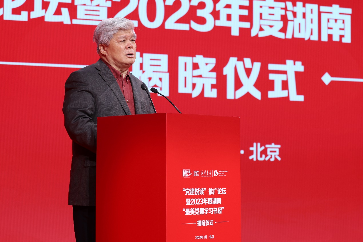 1月28日,“黨建悅讀”推廣論壇暨2023年度湖南“最美黨建學習書屋”揭曉儀式在北京舉行。圖為韜奮基金會理事長劉伯根致辭。