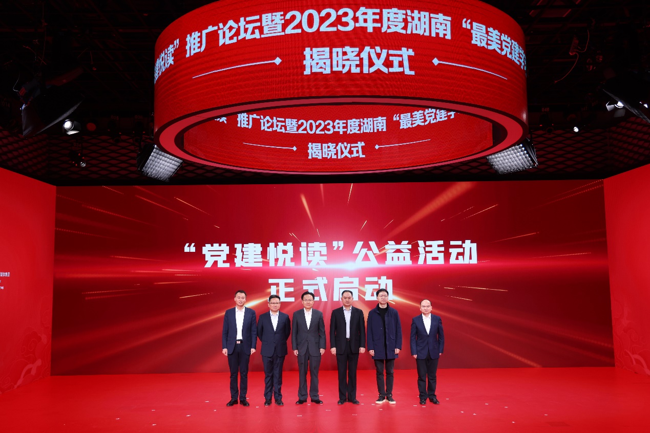1月28日,“黨建悅讀”推廣論壇暨2023年度湖南“最美黨建學習書屋”揭曉儀式在北京舉行。圖為學習強國學習平臺編委、副總經理杜大力,中華人民共和國國史學會光明讀書會會長鄧永標,湖南省委宣傳部印刷發行處處長易宇,中國婦女出版社社長李凱聲,機械工業出版社副社長、北京百萬莊圖書大廈有限公司董事長繆立進,新華網移動悅讀與公益事業部總經理、新華炫聞(北京)移動傳媒科技有限公司副總裁程前昆共同啟動“黨建悅讀”公益行活動。