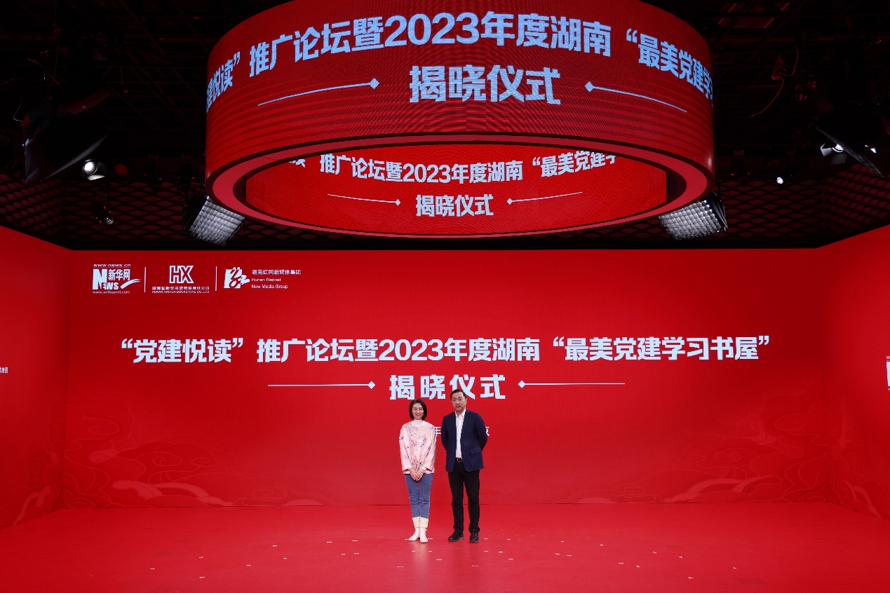 1月28日,“黨建悅讀”推廣論壇暨2023年度湖南“最美黨建學習書屋”揭曉儀式在北京舉行。圖為中南出版傳媒集團副總經理劉閎與人民出版社發行部主任房憲鵬揭曉“最美黨建學習書屋”獲獎名單。