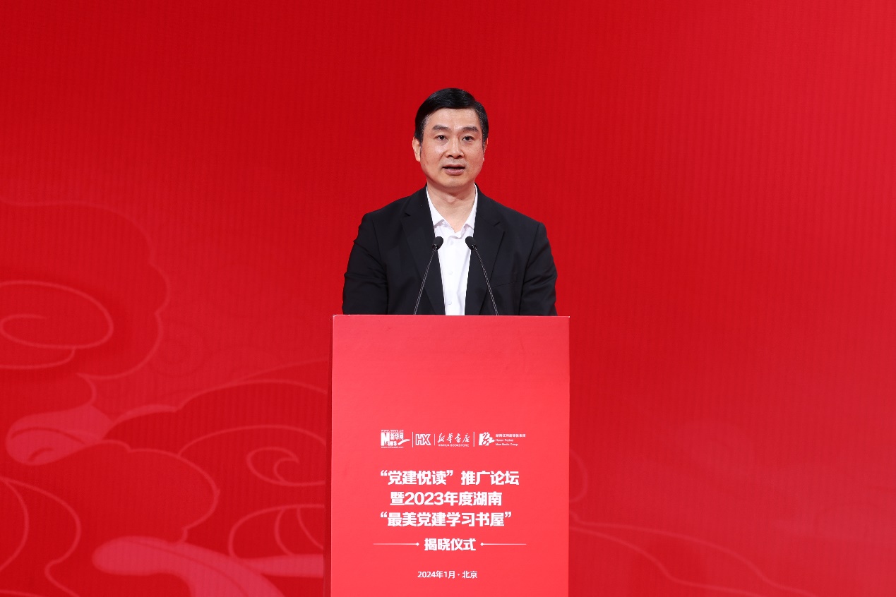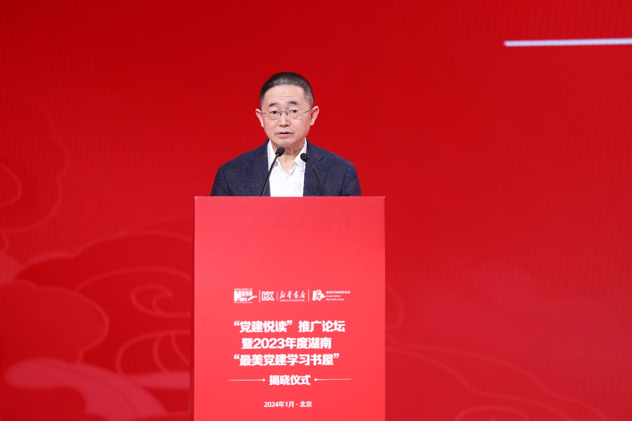 1月28日,“黨建悅讀”推廣論壇暨2023年度湖南“最美黨建學習書屋”揭曉儀式在北京舉行。圖為湖南出版集團黨委書記、董事長,中南出版傳媒集團董事長彭玻致辭。