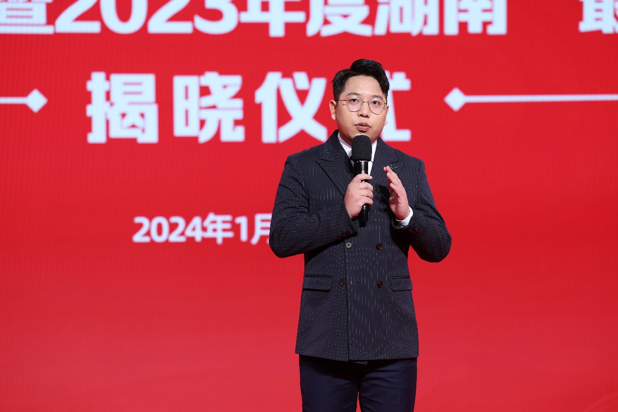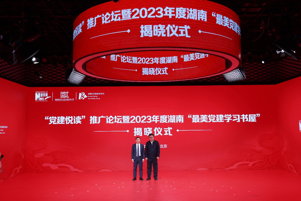 1月28日,“黨建悅讀”推廣論壇暨2023年度湖南“最美黨建學習書屋”揭曉儀式在北京舉行。圖為湖南紅網新媒體集團黨委書記、董事長賀永祥與中國出版傳媒股份有限公司副總經理、人民文學出版社社長臧永清揭曉“全民閱讀推廣達人”獲獎名單。