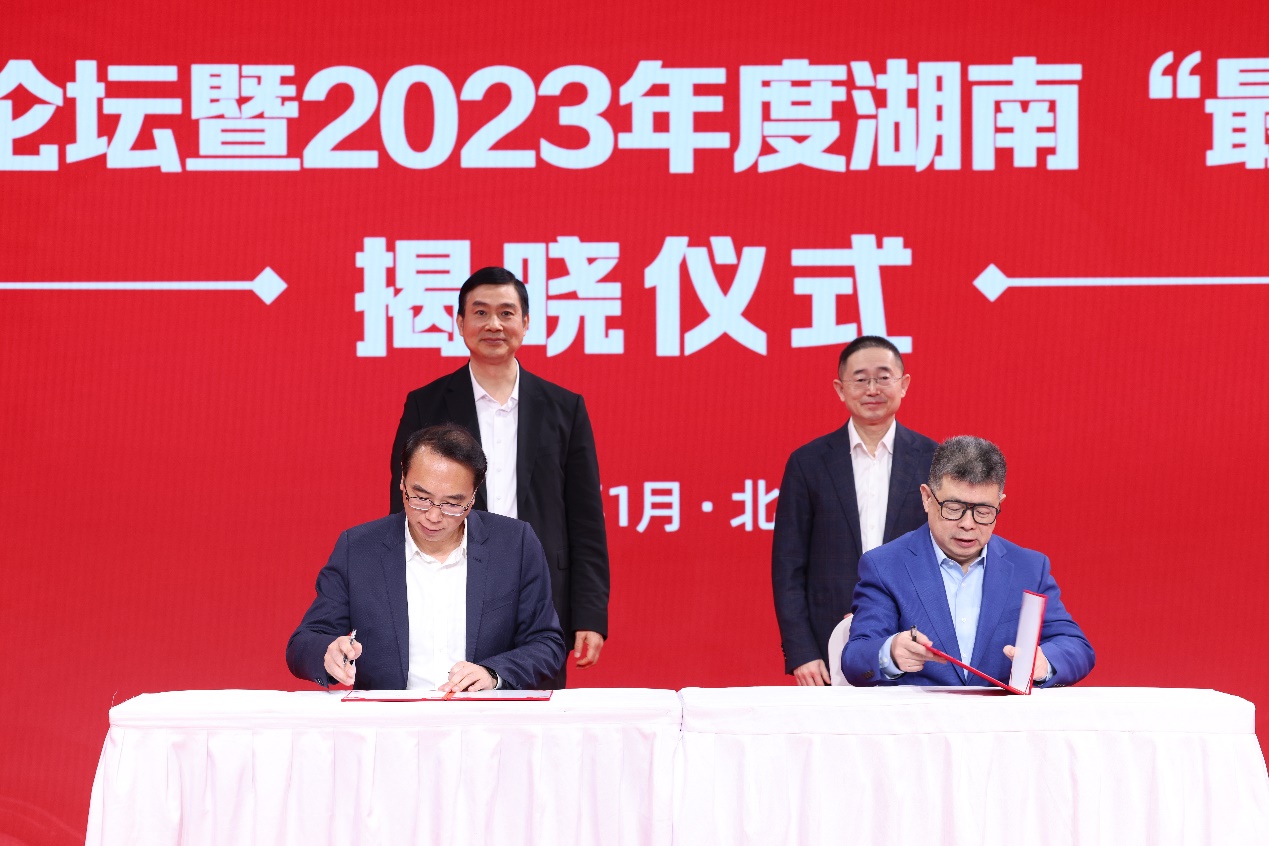 1月28日,“黨建悅讀”推廣論壇暨2023年度湖南“最美黨建學習書屋”揭曉儀式在北京舉行。圖為新華網首席運營官、新華炫聞(北京)移動傳媒科技有限公司董事長、總裁孫巍與湖南省新華書店黨委書記、董事長沈劍鋒共同簽署新華網與湖南新華書店集團框架合作協議。
