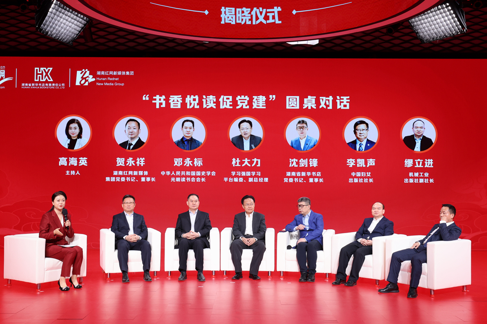 1月28日,“黨建悅讀”推廣論壇暨2023年度湖南“最美黨建學習書屋”揭曉儀式在北京舉行。圖為“書香悅讀促黨建”圓桌對話環節。學習強國學習平臺編委、副總經理杜大力,中華人民共和國國史學會光明讀書會會長鄧永標,中國婦女出版社社長李凱聲,機械工業出版社副社長、北京百萬莊圖書大廈有限公司董事長繆立進,湖南省新華書店黨委書記、董事長沈劍鋒,湖南紅網新媒體集團黨委書記、董事長賀永祥共同圍繞“書香閱讀促黨建”這一主題,深入探討了黨建學習書屋建設對提升全民閱讀的重要意義、如何鼓勵社會各界人士參與到黨建學習書屋的建設和運營等話題。