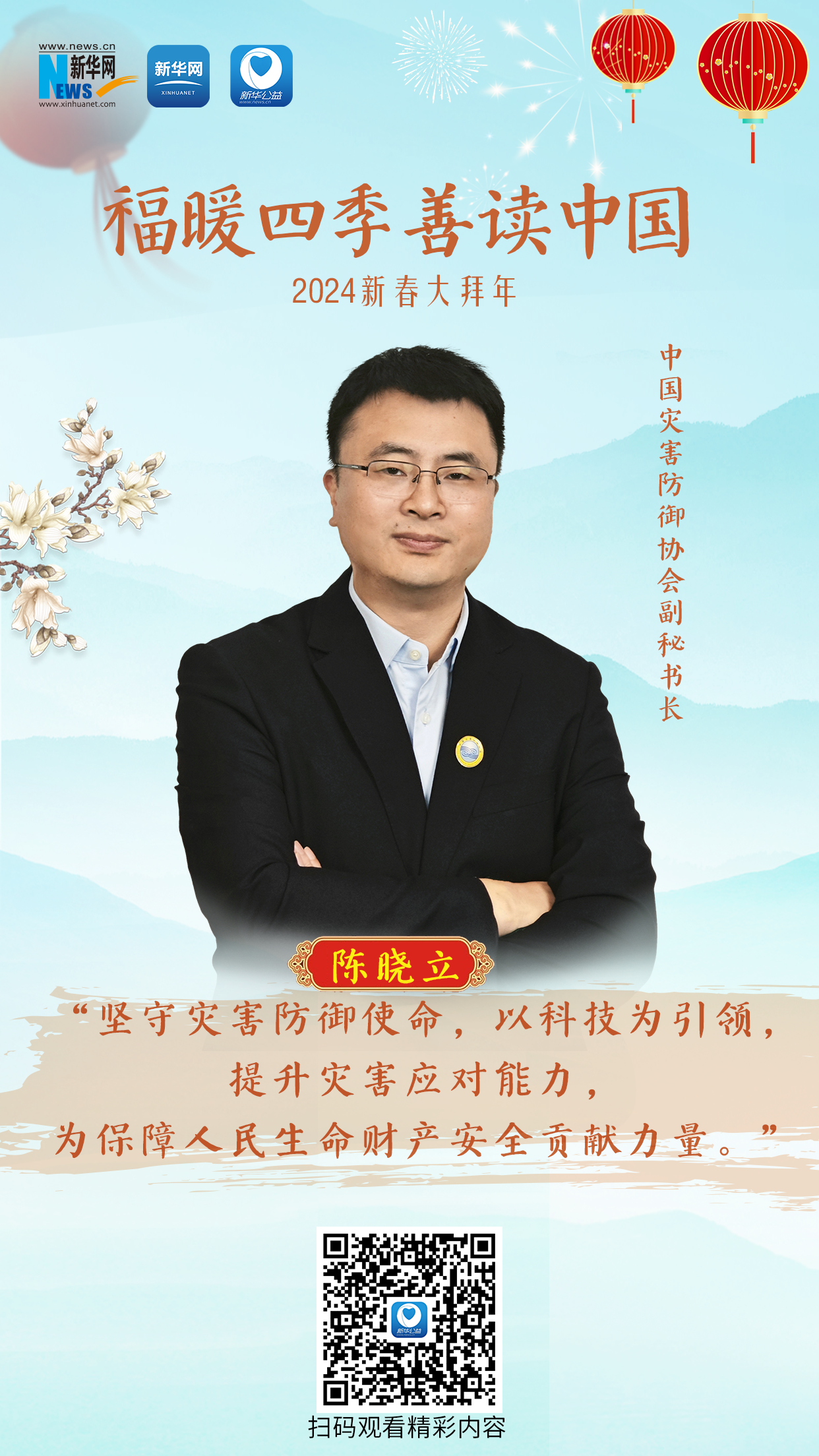 玉兔辭舊,龍騰盛世。新春佳節到來之際,中國災害防御協會副秘書長陳曉立祝大家龍年順意,如龍馬般精神,如龍鱗般堅韌,如龍庭般輝煌,事事如意,歲歲平安!