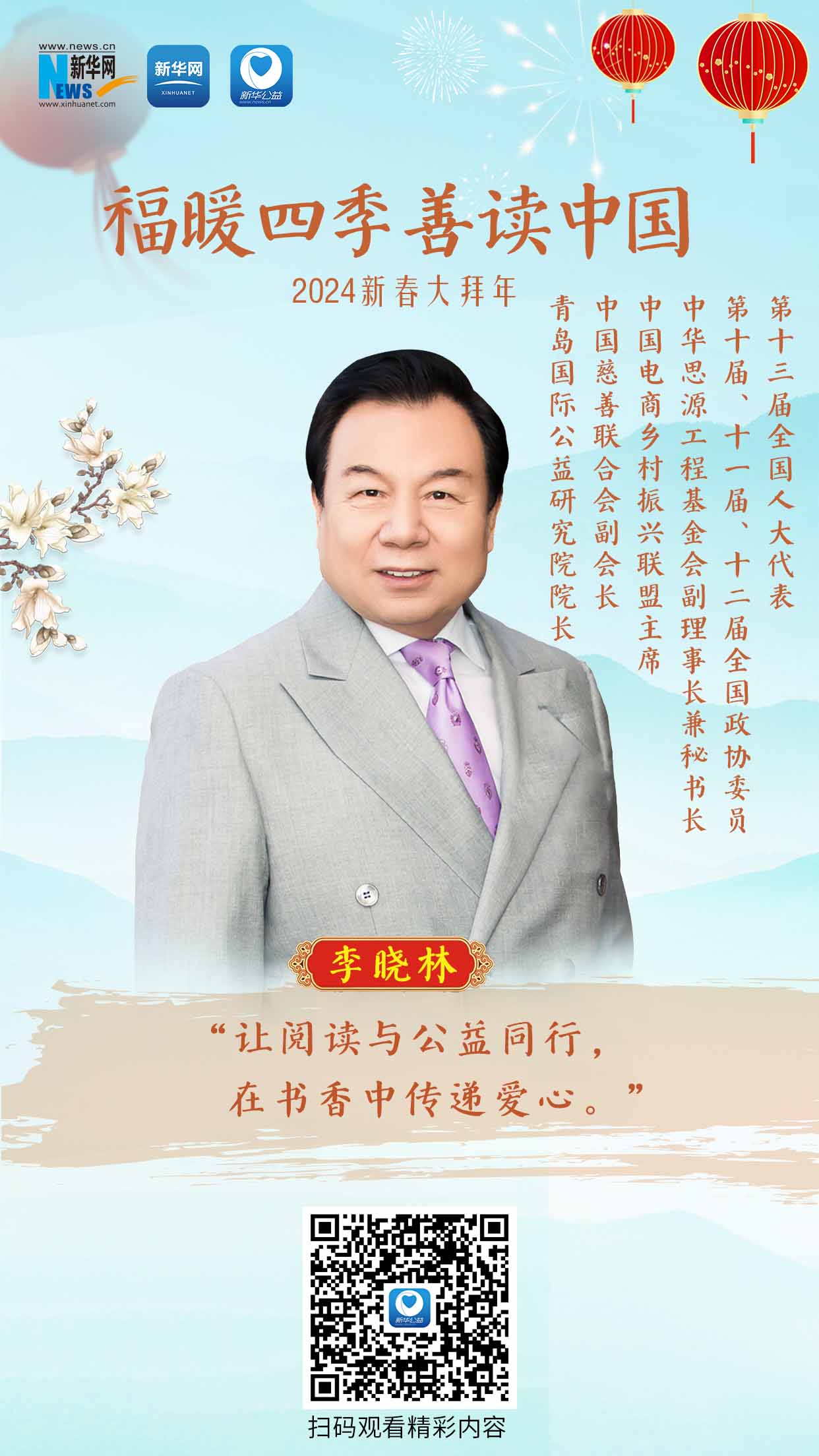 玉兔辭舊,龍騰盛世。新春佳節到來之際,第十三屆全國人大代表,第十屆、十一屆、十二屆全國政協委員,中華思源工程基金會副理事長兼秘書長、中國電商鄉村振興聯盟主席、中國慈善聯合會副會長、青島國際公益研究院院長李曉林博士祝大家龍年行大運、龍馬精神、龍行龖龘、萬事興隆,祝愿偉大祖國繁榮昌盛!
