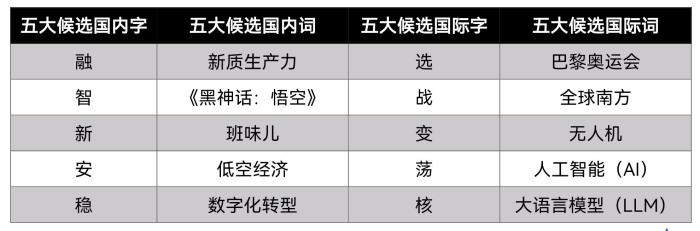 國內字詞前五位分別是“融、智、新、安、穩”和“新質生產力、《黑神話:悟空》、班味兒、低空經濟、數字化轉型”;國際字詞前五位分別是“選、戰、變、蕩、核”和“巴黎奧運會、全球南方、無人機、人工智能(AI)、大語言模型(LLM)”。