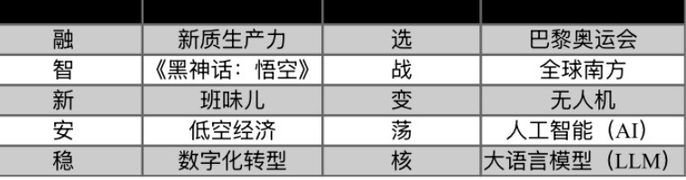 “新質生產力”,堅持“穩”中求進,“數字化轉型”,應對“變”局挑戰。12月9日,“漢語盤點2024”年度各組前五位字詞正式出爐,“融”“智”“選”“戰”“新質生產力”“數字化轉型”“全球南方”“大語言模型(LLM)”等熱門字詞入圍。最終結果將于12月20日“漢語盤點2024”揭曉儀式上發布。