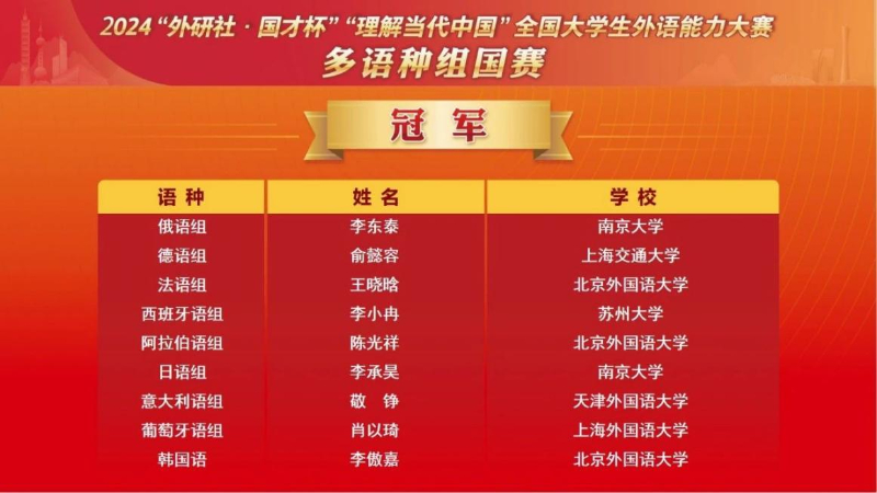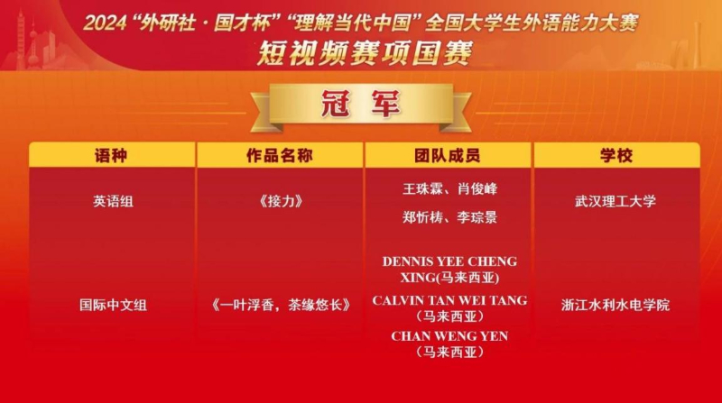 大賽頒獎儀式特別設置“冠軍展示”環節,呈現英語組短視頻賽項、國際中文組短視頻賽項獲獎作品精彩集錦及冠軍作品,展示英語組筆譯賽項冠軍的參賽翻譯文本、英語組口譯賽項冠軍的參賽口譯實況,并由多語種組冠軍用外語分享學習經歷、實踐經驗與參賽所得,體現選手們扎實的語言綜合應用能力和促進文明交流互鑒的志向。