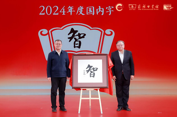 新華網黨委常委、總編輯車玉明(左),商務印書館黨委書記、執行董事顧青(右)揭曉年度國內字“智”。新華網 發