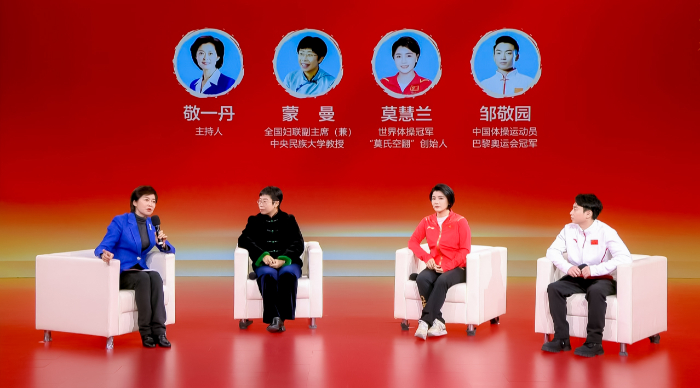 全國婦聯副主席(兼)、中央民族大學教授蒙曼,世界體操冠軍、“莫氏空翻”創始人莫慧蘭,中國體操運動員、巴黎奧運會冠軍鄒敬園接受訪談。新華網 發