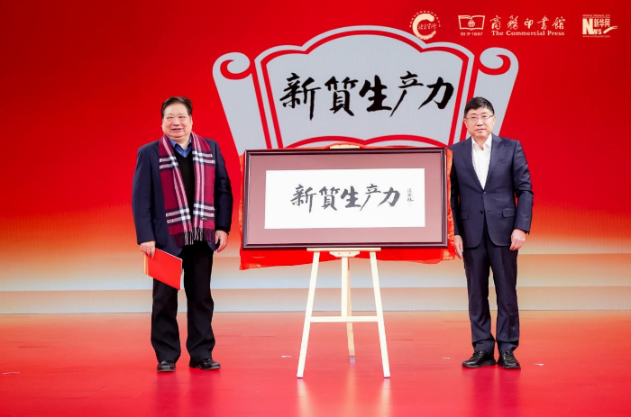 中國辭書學會會長、北京語言大學教授李宇明(左),中國出版集團有限公司副總經理、黨組成員陳永剛(右)揭曉年度國內詞“新質生產力”。新華網 發
