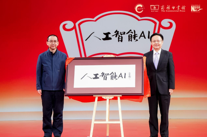 商務印書館副總經理陳晗雨(左),中宣部“學習強國”學習平臺編委、副總經理杜大力(右)揭曉年度國際詞“人工智能(AI)”。新華網 發