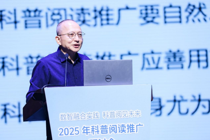 主旨報告環節,李東來以“數智時代科普閱讀更應重視普及認知方法”為題作報告。他表示新時代科普閱讀推廣將面臨新內容與范式的轉變,不再僅僅是知識的普及與告知,而在于思維方式的認知與提煉。