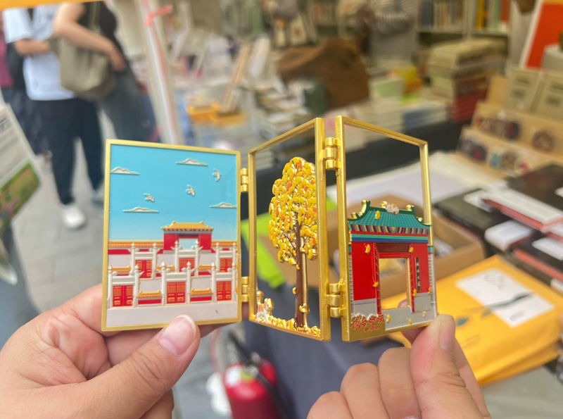 《我與地壇(圖像小說)》、“我與地壇”冰箱貼、史鐵生金句書包更是在本次書市大放光彩。最受讀者關注的《我與地壇(圖像小說)》,是史鐵生的作品首次以圖像小說形式呈現。讀者張女士注意到,插畫以坐在長椅上的“我”為主觀視角,選取《我與地壇》文中的古樹、車轍、夜空、看不見的“園神”等經典意象描繪,與文本有機呼應。讀者在閱讀中,仿佛親身置于園中,穿越時空,沉浸式地感受地壇的歲月流轉,走進史鐵生的精神世界。而在廣西師范大學出版社展位,記者看到一款新穎別致的“我與地壇”三折疊冰箱貼,地壇公園正門、方澤壇與銀杏樹巧妙合成一體,工作人員閆金金說:“去年我們的‘地壇看?!滟N非?;鸨?,今年我們做出了更有意義更好看的新款?!弊哌M“我在地壇”書店展位,史鐵生金句書包受到讀者的熱切關注,一款火紅的書包上,“在滿園彌漫的沉靜光芒中,一個人更容易看到時間,并看見自己的身影”直擊人心;另一款綠色的書包上,“在人口密聚的城市里,有這樣一個寧靜的去處,像是上帝的苦心安排”引人遐思。