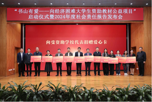 10月11日,高等教育出版社(簡稱:高教社)“書山有愛”向經濟困難大學生資助教材公益項目啟動儀式暨2024年度社會責任報告發布會在北京舉辦。中國出版協會副理事長兼秘書長王利明,全國學生資助管理中心黨委書記、主任陳淑梅,副主任王俊,中國教育發展基金會副秘書長成梁,中國教育出版傳媒集團副總經理周增宇,教育部宣傳教育中心副主任楊晨光,中華慈善總會副秘書長曾春光;高教社黨委副書記、總編輯譚方正,社黨委委員、副總編輯賈瑞武,副社長、總會計師王衛忠,紀委書記張靜,副社長葉波等出席活動。
