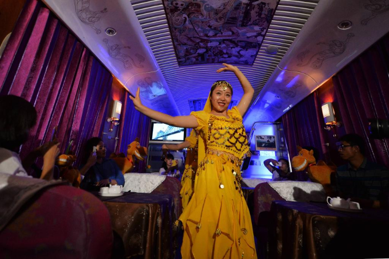 在蘭州鐵路局首發的“敦煌號”列車上,列車員身穿敦煌元素的服飾為旅客表演敦煌舞(2014年7月10日攝)。 記者:陳斌、郎兵兵