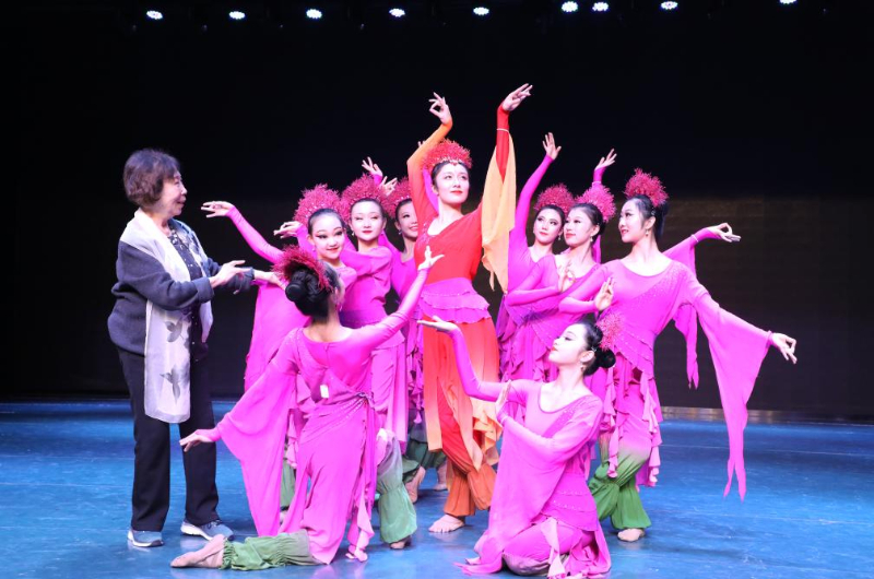 在蘭州音樂廳,高金榮指導學生表演敦煌舞教學劇目《沙漠紅柳》(2019年11月28日攝)。