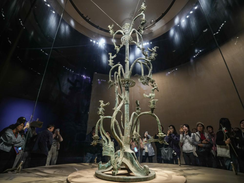 游客在四川省廣漢市三星堆博物館參觀青銅神樹(10月30日攝)。