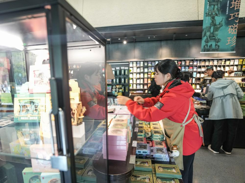在四川省廣漢市三星堆博物館文創商店,工作人員往貨架上補充文創產品(10月30日攝)。