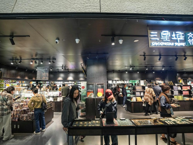 旅客在位于成都東站的三星堆博物館與鐵路部門聯名文創專區商店內選購文創產品(11月3日攝)。