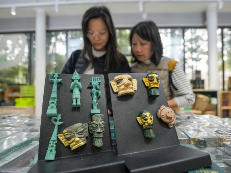 游客在四川省廣漢市三星堆博物館內的文創商店選購文創產品(10月30日攝)。