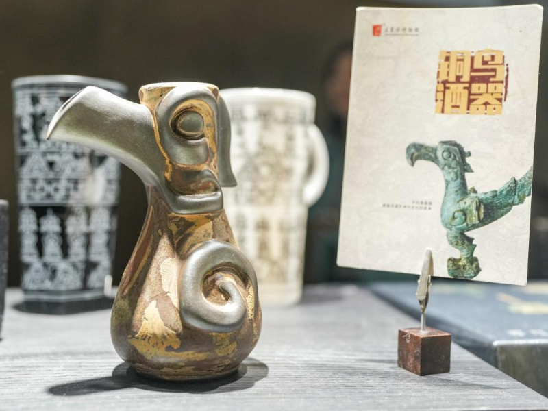 10月30日在四川省廣漢市三星堆博物館內的文創商店拍攝的文創產品銅鳥酒器。