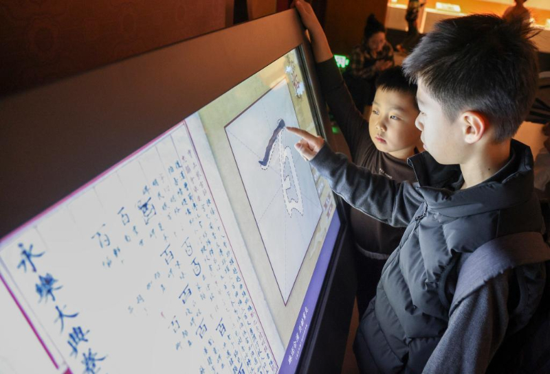 11月22日,參觀者在國家典籍博物館的互動區學寫永樂大典中的字體。