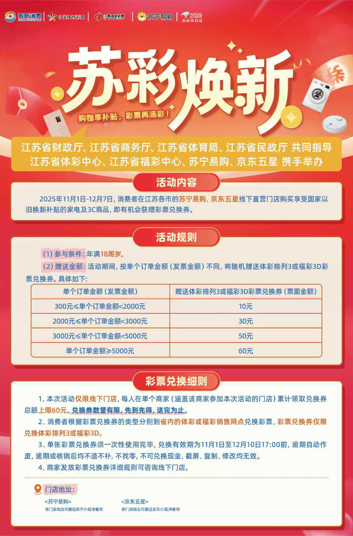 11月1日,在江蘇省財政廳、江蘇省商務廳、江蘇省民政廳、江蘇省體育局共同指導下,江蘇省體育彩票管理中心和江蘇省福利彩票管理中心啟動“蘇彩煥新”第四期活動。本次活動將持續至12月7日,活動期間,消費者在江蘇省內13個市的蘇寧易購、京東五星線下直營門店購買享受國家以舊換新補貼(以下簡稱國補)指定商品(家電、3C商品),即有機會獲贈彩票兌換券。