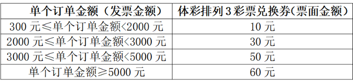 11月1日—12月7日,“蘇新消費·蘇彩煥新”第四期活動將全面開展?;顒悠陂g,年滿18周歲的消費者,在江蘇省內13個市的蘇寧易購、京東五星線下直營門店購買享受國補指定商品(家電、3C商品),即有機會按單個訂單消費金額(發票金額)獲贈不同面值的彩票兌換券。其中,體彩贈送的是排列3彩票兌換券,兌換券以二維碼形式發放。具體如下: