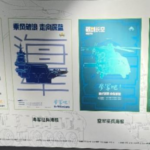 設計說明:征兵主題紀念掛件設計依據各軍種海報中特有的設計元素進行再創作,其中包含陸軍、海軍、空軍、火箭軍字體樣式設計的紀念章,概括性的表達字體內涵,同時輔以軍種特有的色彩,加強認知意識。將各海報中特有的標題字體進行轉化,將各武器裝備外形作為掛件的主體形,表現我軍現有裝備力量,強化對海軍形象認知。