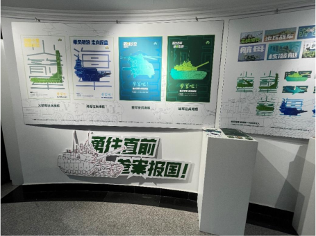 最后是關于布展物料以及模擬征兵現場的內容設計,包含 KT 展板、條幅掛布、征兵宣傳單、明信片等。所有設計內容均以動態海報中的內容元素為基礎進行再設計,形成較強的系統性展示。