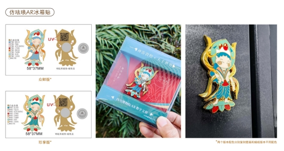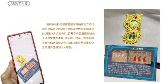 設計說明:以張大千先生臨摹北魏敦煌壁畫三世佛為藍本,我們嘗試以卡通年輕化的風格形式臨摹這幅作品,附加現代AR技術,得以在方寸之間,通過具象化的物件、圖像、語音等手段將這件傳世作品重新表達呈現。