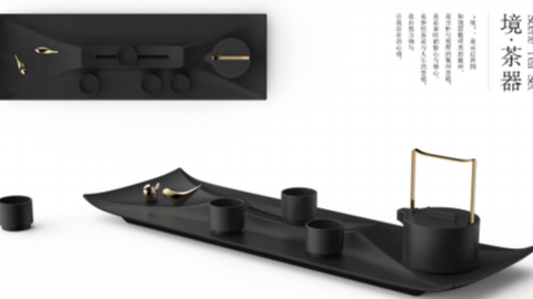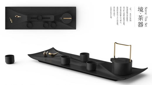 設計說明:這套茶具靈感來源于徽派建筑中的天井元素,將四水歸堂的理念與茶盤出水口相融合,茶水沿其四壁順流而下,重現“灑金流銀”之景;將馬頭墻的翹檐元素巧妙融于茶壺提手與茶盤之中,再加兩只棲息于檐前觀雨的鳥兒作陪,使品茗者仿佛置身于這雨中徽州,定心感受“天地與我并生,萬物與我為一”的自由境界。茶盤造型以方正為主,符合徽州建筑特點,材質上以烏金石與黃銅搭配,沉靜且富有力量,靜坐于這茶盤之側,使人不由得外觀天地,內審自我。