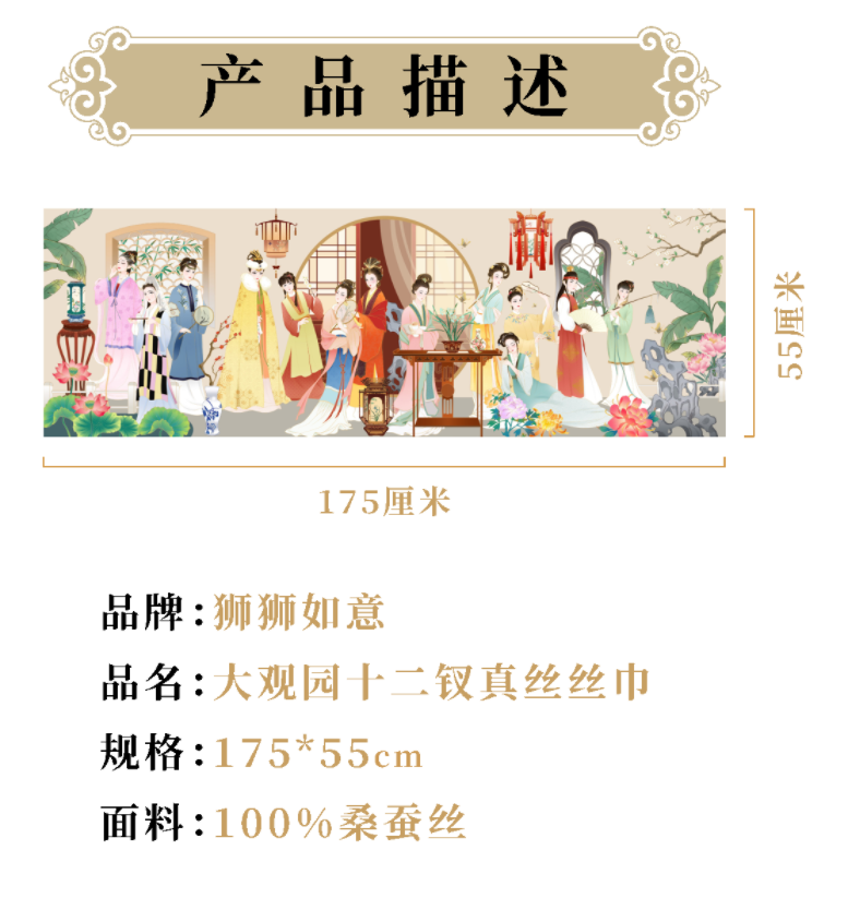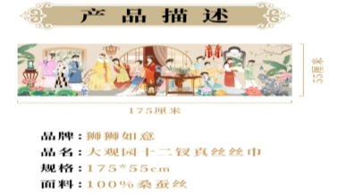 上海大觀園將照壁上的“金陵十二釵”重新繪畫設計,配以豐富的色彩,各個人物姿態、神情、服裝也各不相同,細微之處盡顯其人物形象、性格和生平經歷等,其中亦有“黛玉葬花”“寶釵撲蝶”“惜春作畫”“妙玉奉茶”等經典故事情節。紅樓人物印于真絲絲巾,當文化與實物相碰撞,上海大觀園希望能將紅樓故事講給更多人聽。