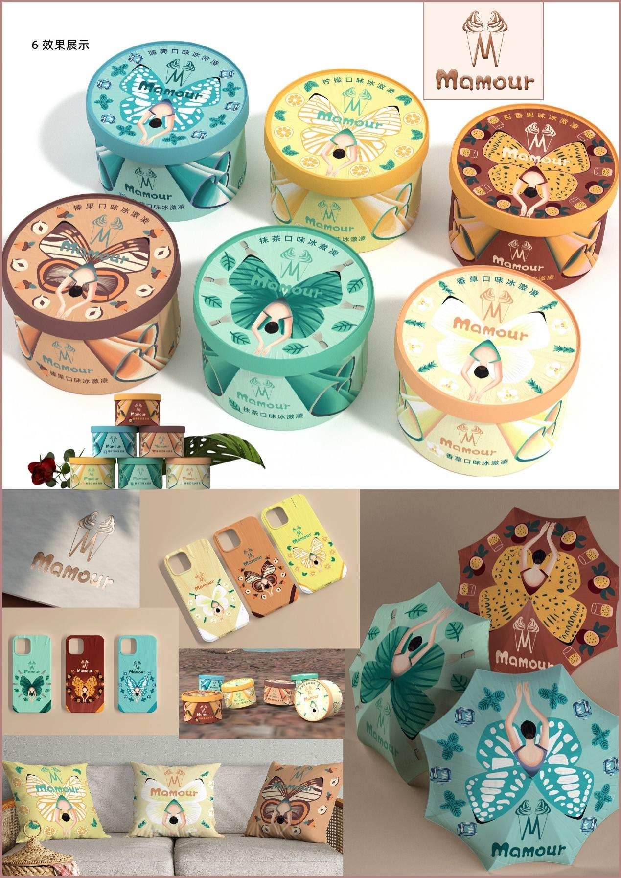 設計說明:文創雪糕是各地文旅的爆火產品之一,但對于年輕的情侶游客來說,杯狀的冰激凌食用起來更加方便、衛生。Mamour品牌冰激凌為滿足這一市場需求而問世。