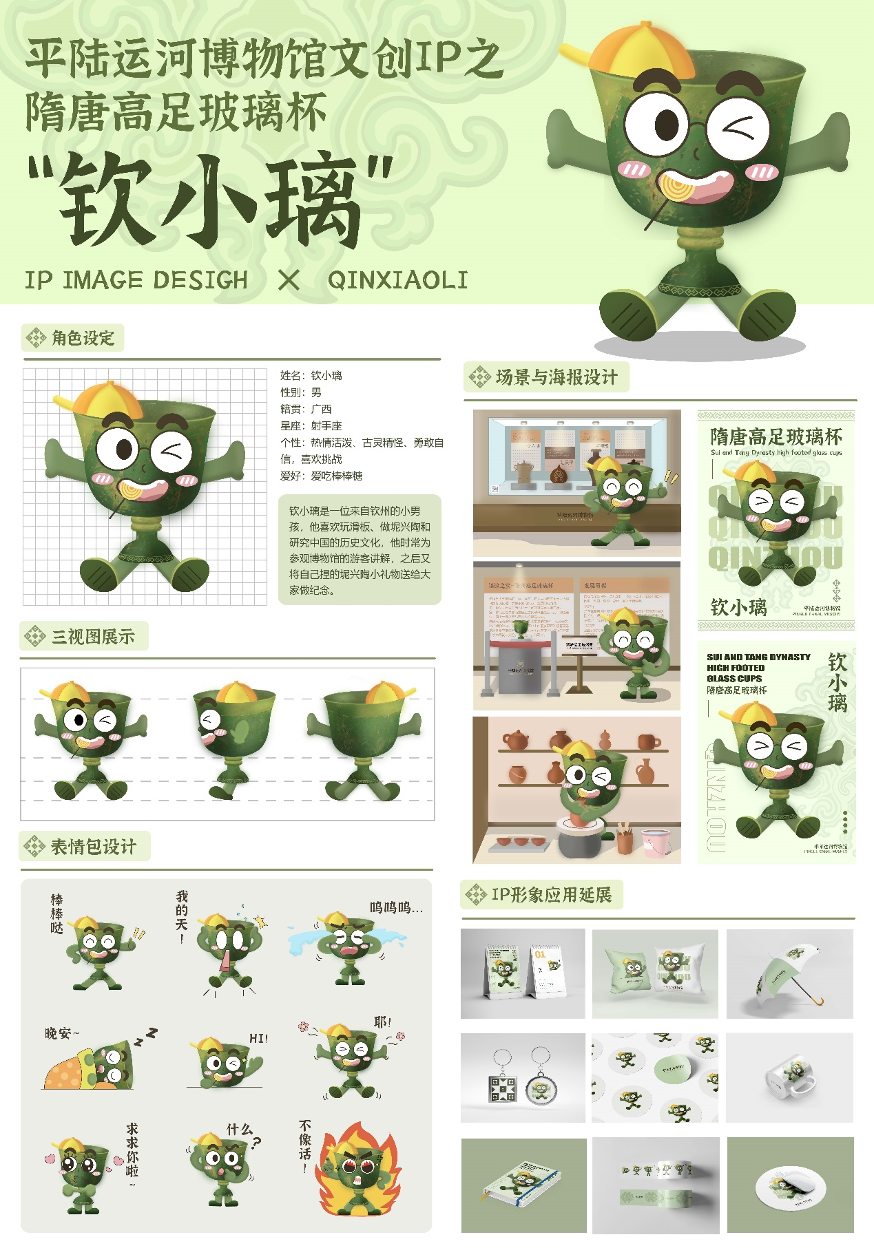 設計說明:此IP形象設計靈感來源于欽州博物館的鎮館之寶---隋唐高足玻璃杯,在此基礎上,添加了壯錦特色紋樣元素,加強了地域性特征,Q版形象在視覺上顯得人物更加可愛,大大的眼睛,有感染的露齒笑,特色的小豁牙,臉蛋上的腮紅,還有愛吃棒棒糖的可愛人設,增加了親和力,是古代文明與現代潮流的碰撞。欽小璃是一位來自欽州的小男孩,他喜歡玩滑板、做坭興陶和研究中國的歷史文化,他時常為參觀博物館的游客講解,之后又將自己捏的坭興陶小禮物送給大家做紀念。