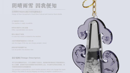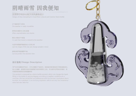 設計說明:本產品為風暴瓶掛件設計,它可以隨著天氣的變化,瓶內液體填充物會有不同程度的變化,給人以提醒,這與努爾哈赤云板報警作用有異曲同工之處,作為掛件它可掛在任意處,既有觀賞性又有趣味性。