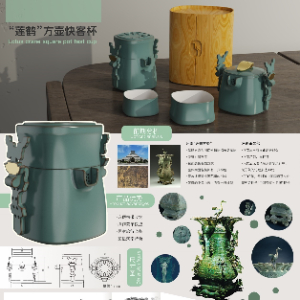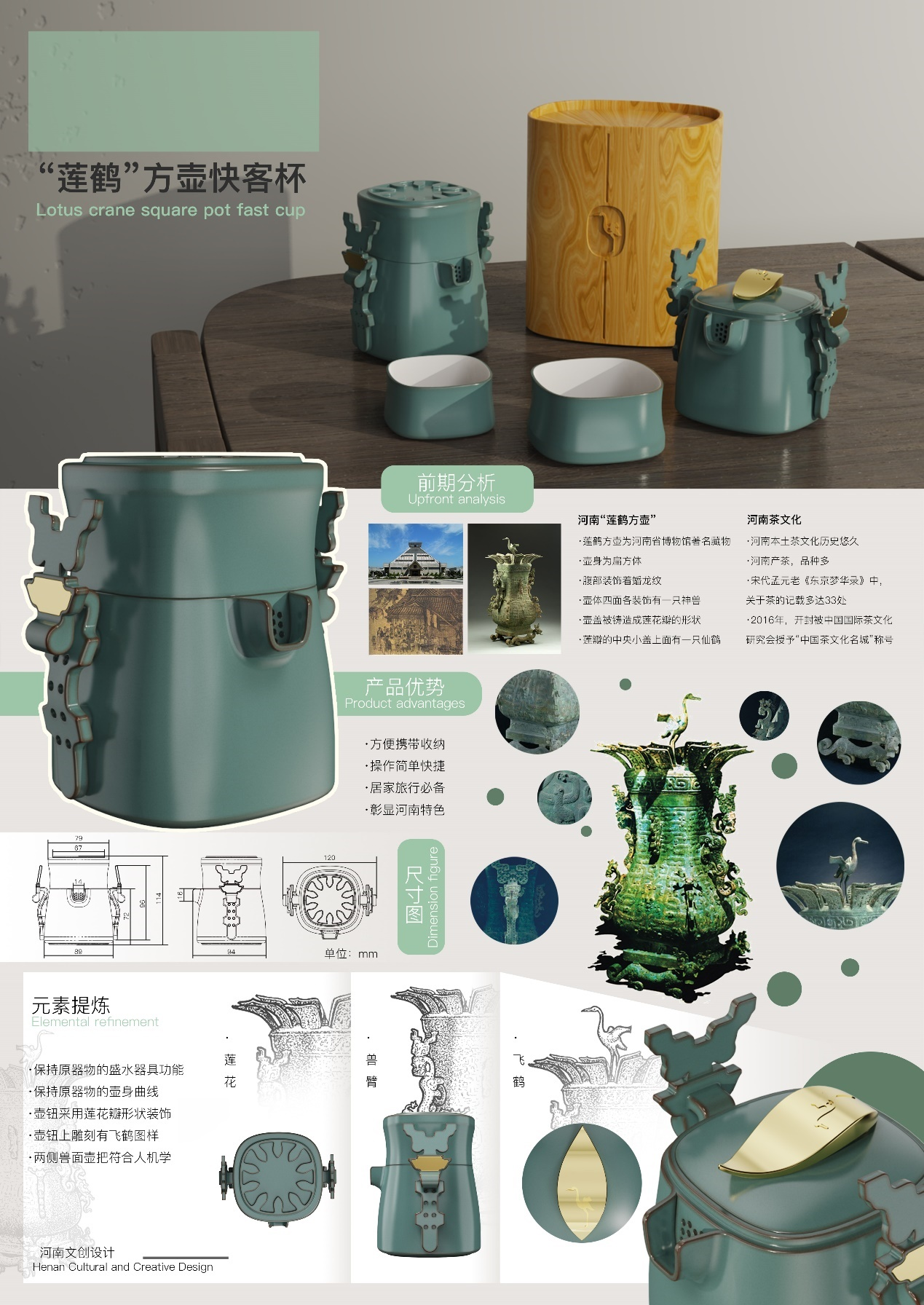 設計說明:春秋蓮鶴方壺,是春秋中期青銅制盛酒或盛水的器具,1923年出土于河南新鄭李家樓鄭公大墓,一收藏于北京故宮博物院青銅館,一收藏于河南博物院,亦為河南博物院鎮館之寶。本快客杯設計,是對原文物盛水器具功能的延續與再創作。本快客杯設計提煉原文物之造型語言,維持方壺的方體造型與壺身曲線并在保持其獨特韻味的基礎上對各個部分進行抽象概括與簡化:壺頂蓮葉綻開,壺側雙龍旁顧,壺蓋之上靜躺一片金葉,一只飛鶴躍然其上。莊重大氣的壺身造型與輕盈柔美的金葉碰撞出了別樣的韻味,這亦是原文物所獨有的造型美感與風韻之所在。
