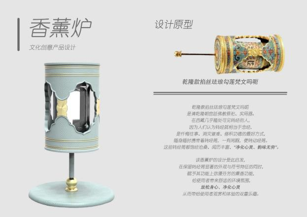 設計說明:此文創產品以沈陽故宮博物院館藏的乾隆款“掐絲琺瑯勾蓮梵文嗎呃”為設計對象進行文創設計。