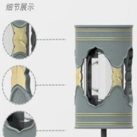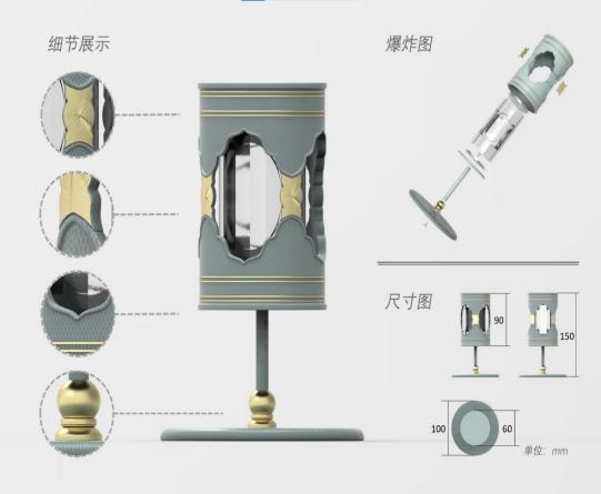 產品采用內外雙筒結構,外筒為PVC塑料布紋與環形金屬拉絲貼片組合的外裝飾套,內筒為多內棱透鏡玻璃與金屬內棱凸沿扣蓋組合的香薰液容納內筒,整體為上下分離式結構。