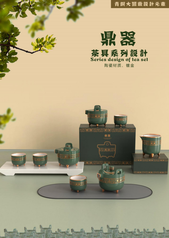 設計釆用了青銅大圓鼎里面的元素而設計的一組茶具系列設計,以沿襲和發揚青銅大圓鼎文化的時尚為宗旨,并賦予現代的審美與生活習性,使傳統與現代結合。結合綠釉,營造出恬淡,悠然的設計意境,同時又不失現代的時尚理念,使人們在忙碌之余可以停下來享受器物與生活的美好。