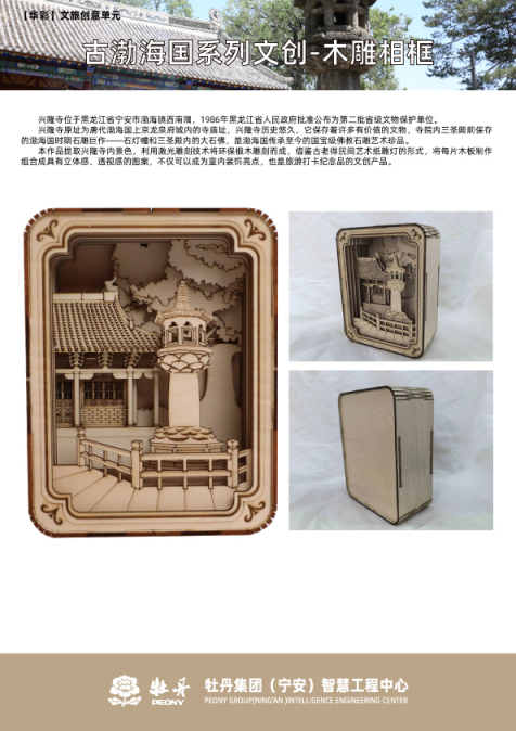 興隆寺位于黑龍江省寧安市渤海鎮西南隅,1986年黑龍江省人民政府批準公布其為第二批省級文物保護單位。本產品提取興隆寺內景色,利用激光雕刻技術用環保椴木雕刻而成,借鑒古老的民間藝術紙雕燈的形式,將每片木板制作組合成具有立體感、透視感的圖案,可以成為室內裝飾亮點。