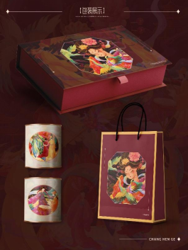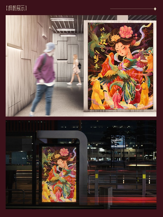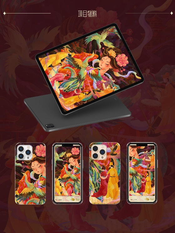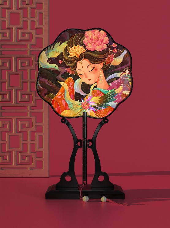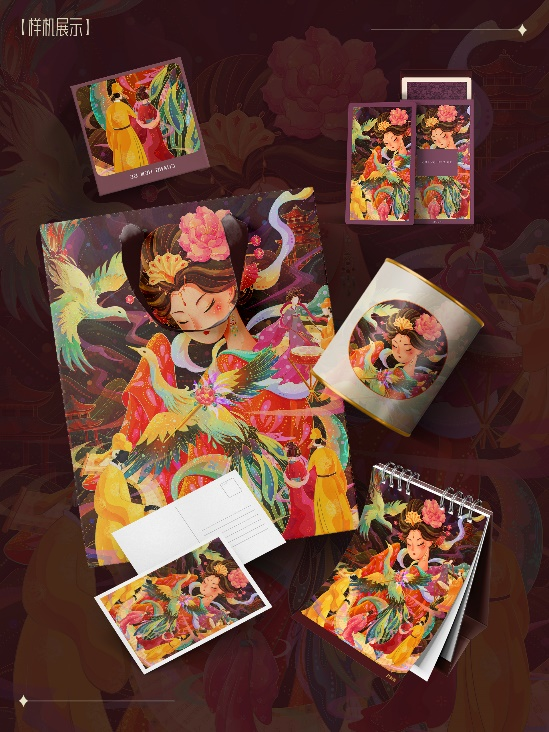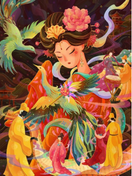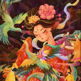 以楊貴妃和比翼鳥為主體創作本插畫,前景為唐玄宗翻看《長恨歌》卷軸,從中回憶過往美好瞬間。