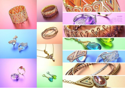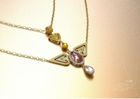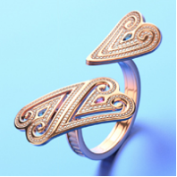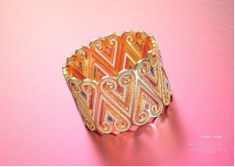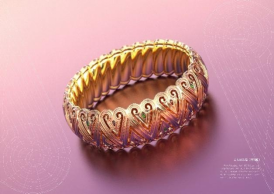 云頭紋又稱如意紋,其形狀似下垂的如意。元朝之前,如意紋多用于金銀器上。元朝后,景德鎮的青花與青白瓷上開始出現如意紋。本套首飾紋樣取自南宋鏨刻云頭紋銀杯,其形狀近似心形,通過紋樣組合延伸成一套首飾。