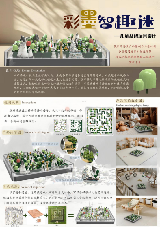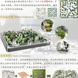 本產品是一款益智類玩具,主要參考華容道和迷宮這兩種游戲,假山以吳冠中的作品風格為主,打造出的一款益智玩具。