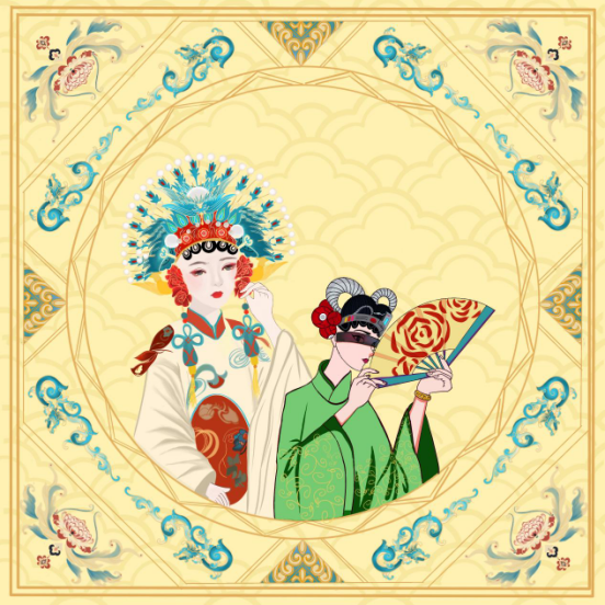 運用了京劇元素以及窗花的對稱元素,可用于絲巾和其他周邊設計。色彩搭配借鑒了敦煌壁畫的色彩,同時也結合了一些未來的元素,有賽博未來與傳統的碰撞。在外輪廓上選取了一些北京傳統的紋樣,進行畫面豐富,京劇人物頭飾也使用了中國的國花牡丹,以及鳳凰鳥等元素,還在底部添加了一些暗紋增加畫面的層次感。