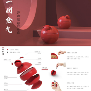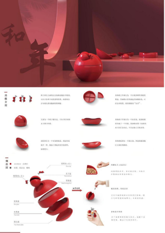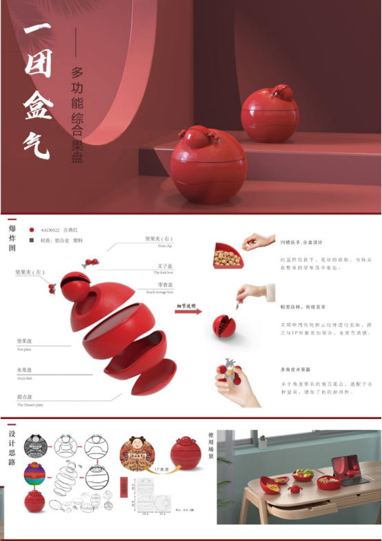 通過對非遺的再創作,提取春節意象,設計出一款多功能綜合果盤。產品基于國家級非物質文化遺產的桃花塢木版年畫——《一團和氣》,將茶幾上所需的各個收納盒進行整合,讓我們的桌面更有序;通過抽象的年畫形象,建立起一個IP化的綜合果盤,組合起來又成為一個年畫擺件。