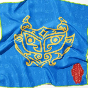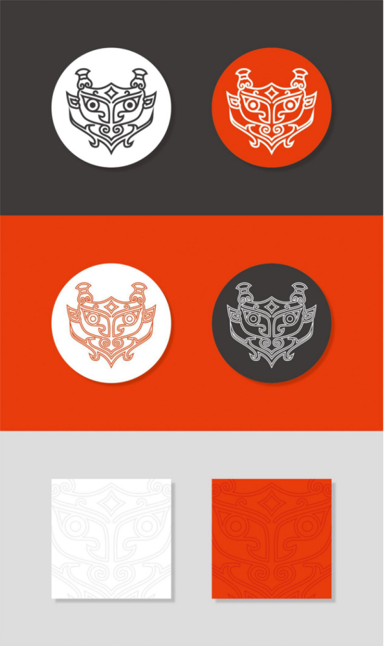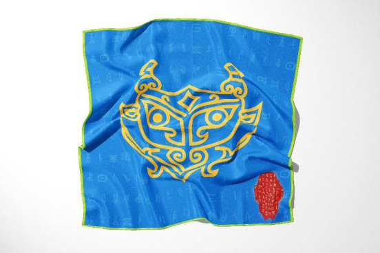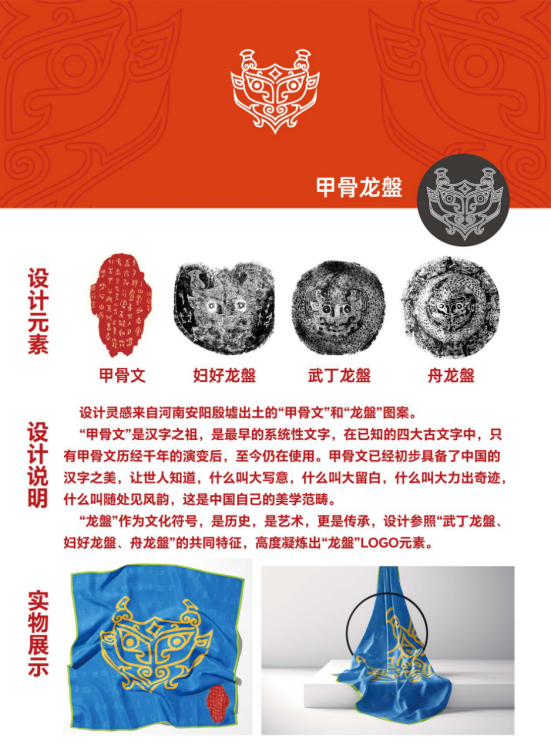 設計靈感來自河南安陽殷墟出土的“甲骨文”和“龍盤”圖案,參照“武丁龍盤、婦好龍盤和舟龍盤”的共同特征,高度凝煉出“龍盤”LOGO元素。并以此制作出絲巾。