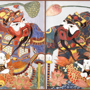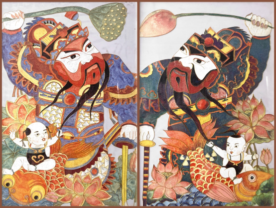 《門神》掐絲琺瑯畫的繪畫藝術題材采自民間木版畫,秉承其質樸的用線造型特點,反映了中國傳統藝術崇尚和諧與優美的古典美學思想。傳統的掐絲造型多圖案程式化,在造型構圖上比較呆板,通過借鑒木版年畫的造型用線,讓掐絲可運用“密不透風、疏能跑馬”的對比用線技法,在造型上體會民間木版畫的質樸與率真之美?!堕T神》掐絲琺瑯畫采用全局布滿物象的構圖方式來表現,以畫面內容豐富飽滿來表現“福壽”多的吉祥主題,加之傳統的點藍技藝,運用刮刀分色、潤色、混色等運色技法,形成艷而不俗的色彩畫面,賦予其獨特的視覺語言。