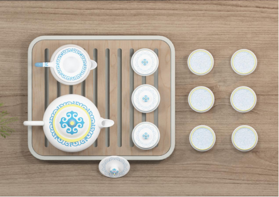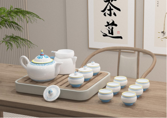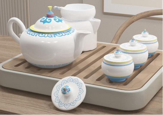 該茶具系列以非遺蒙古包為設計元素,將蒙古族的傳統文化與茶藝相結合,展現了一種獨特的文化韻味。茶壺、茶杯、公道杯和茶漏的設計都融入了蒙古包的經典造型、傳統紋樣和獨特風情。